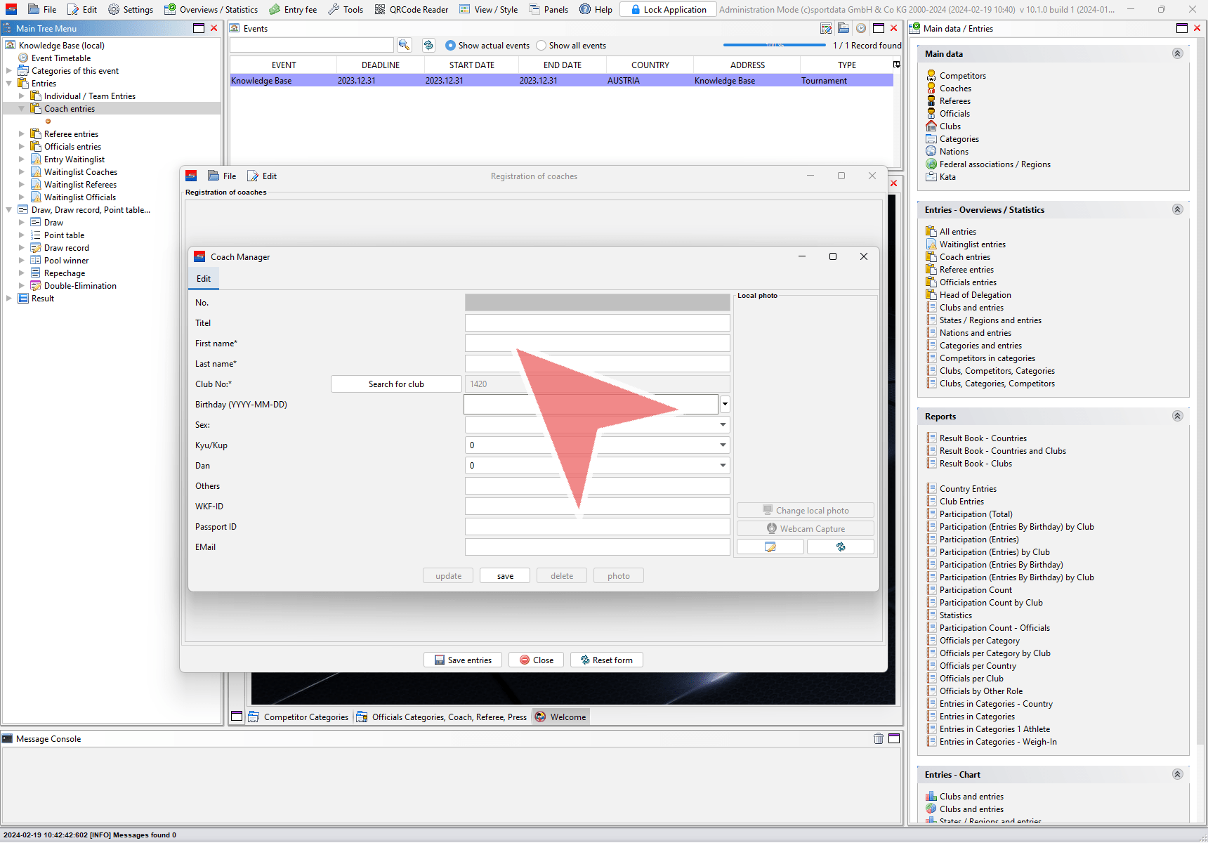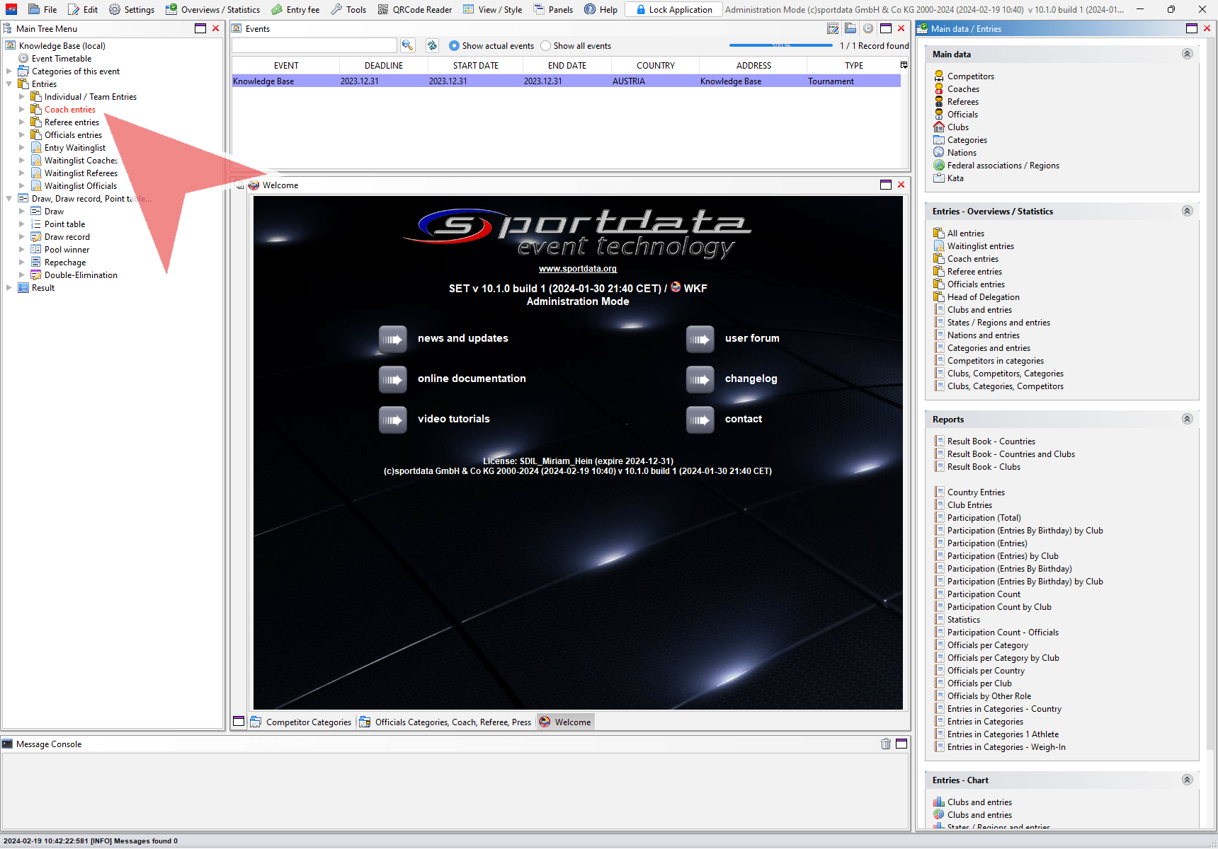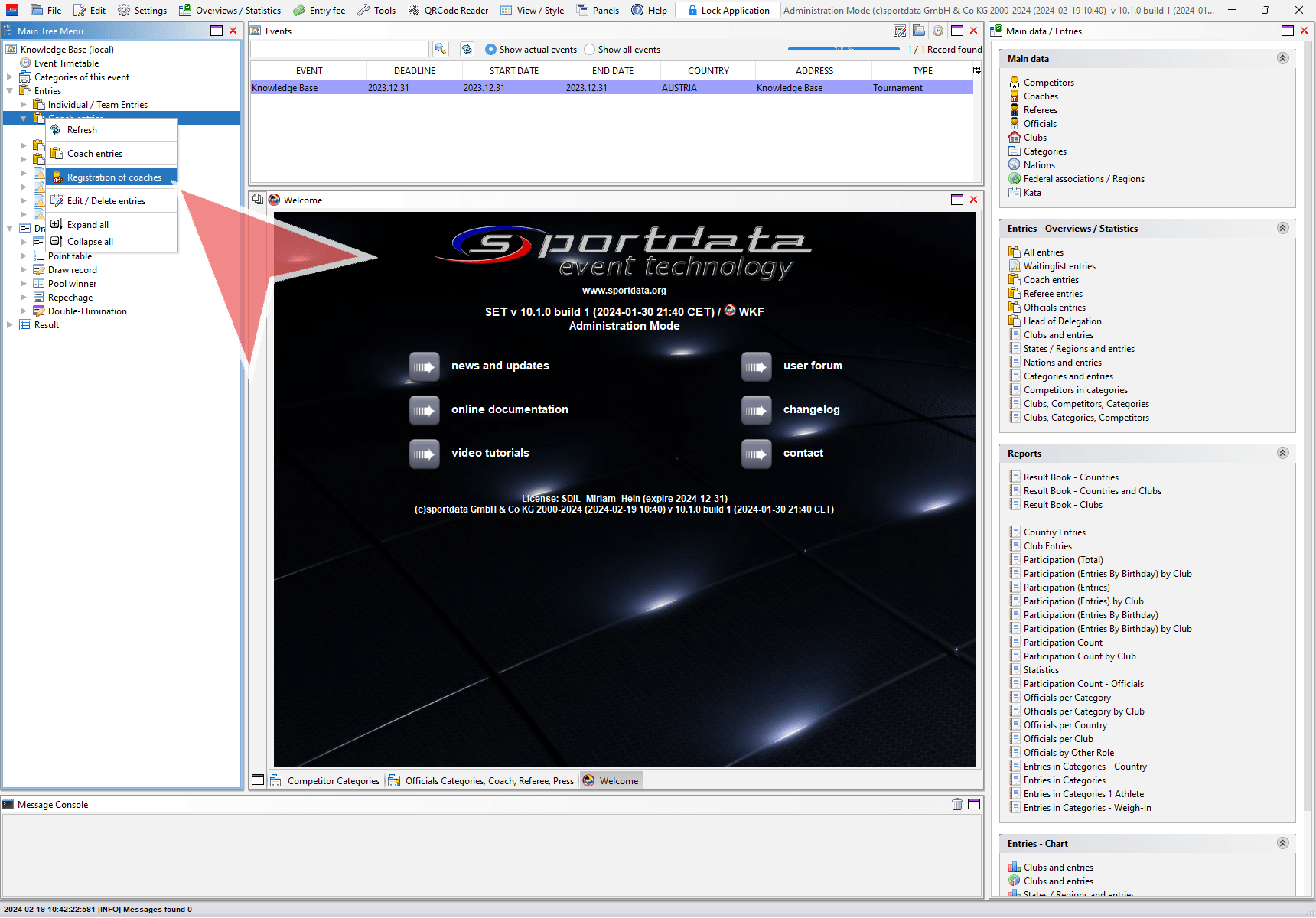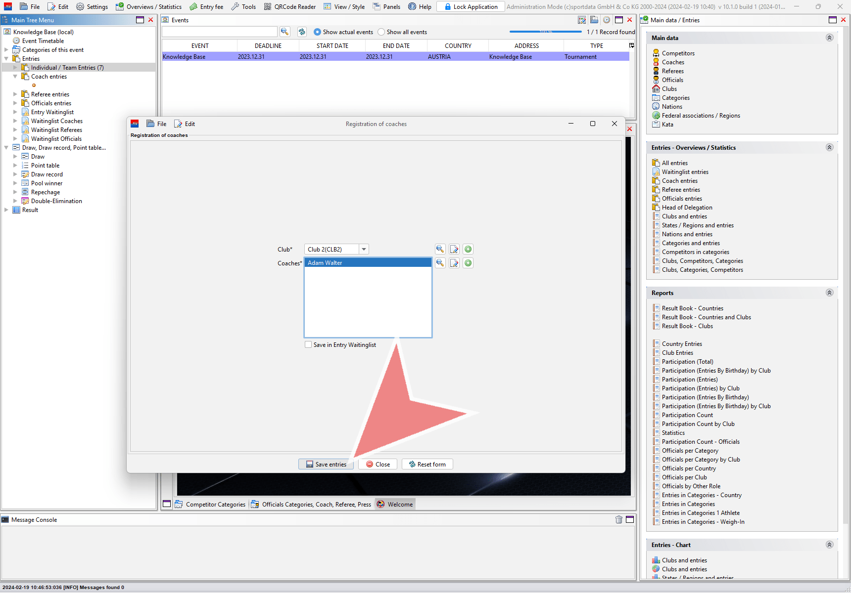 To access the list of all currently registered coaches, rightclick on “Coach entries” in the Main Tree Menu.