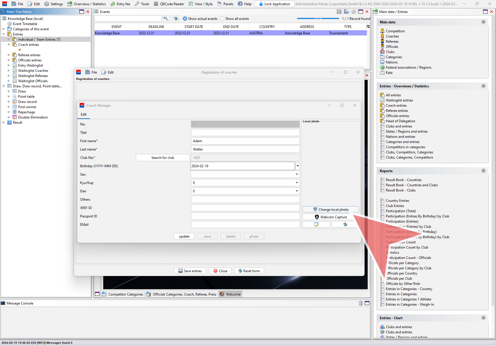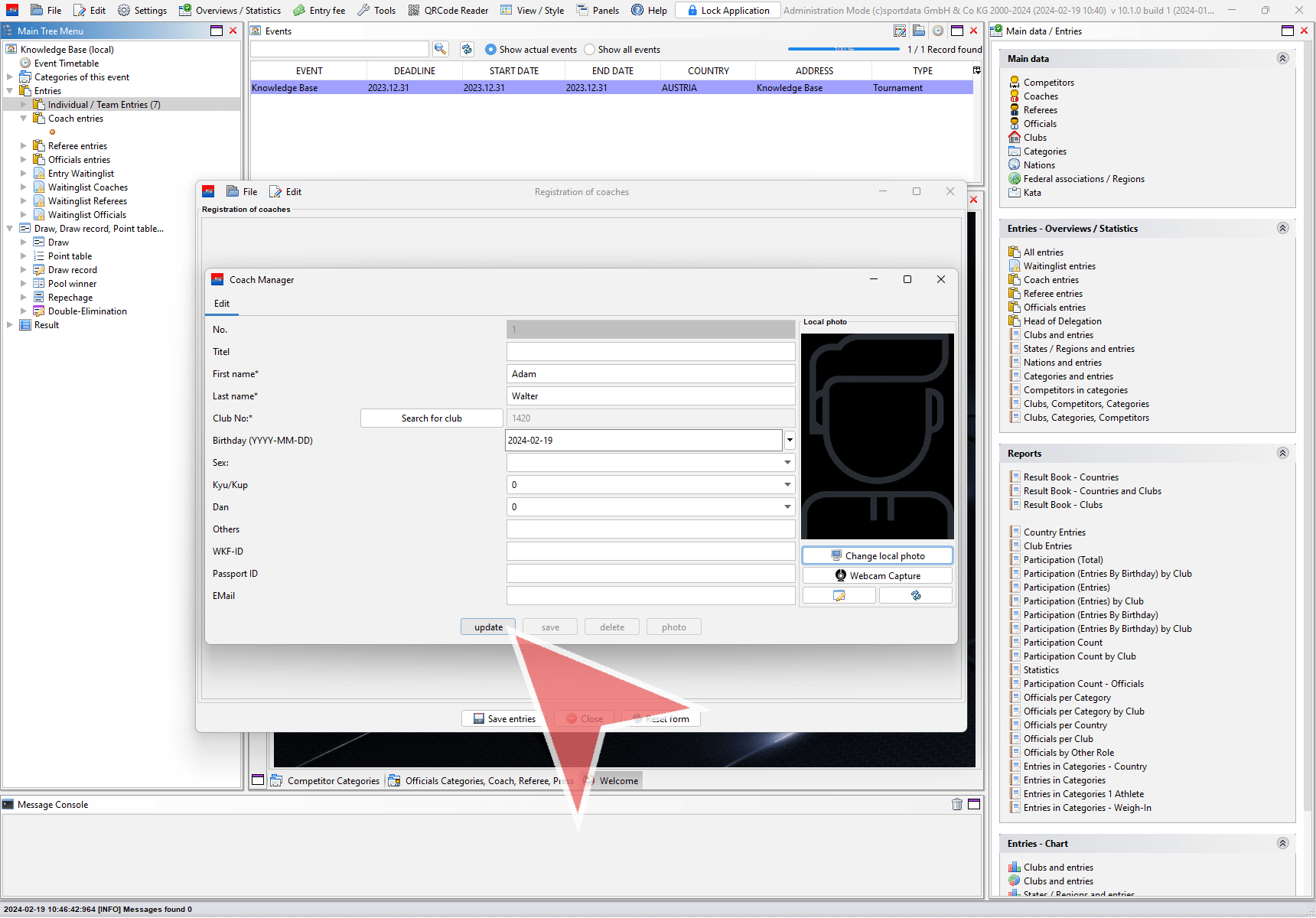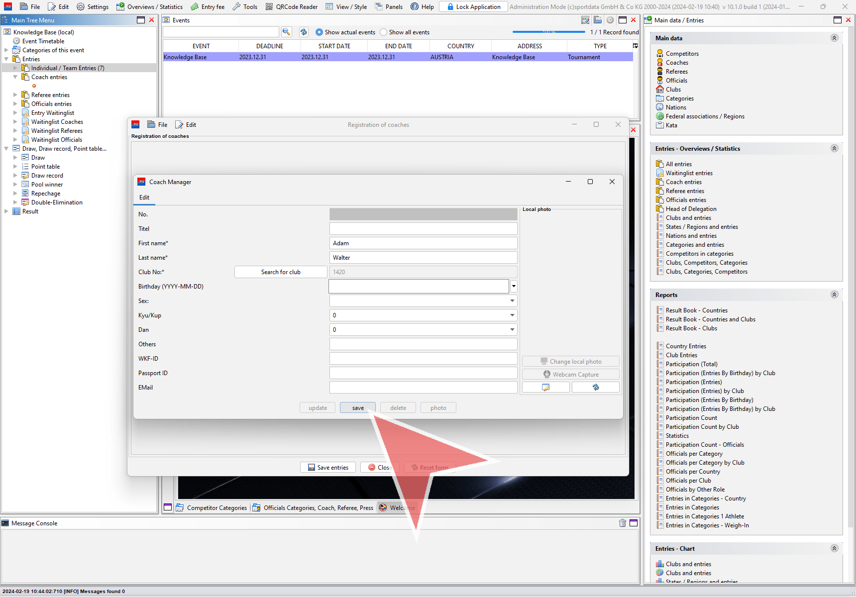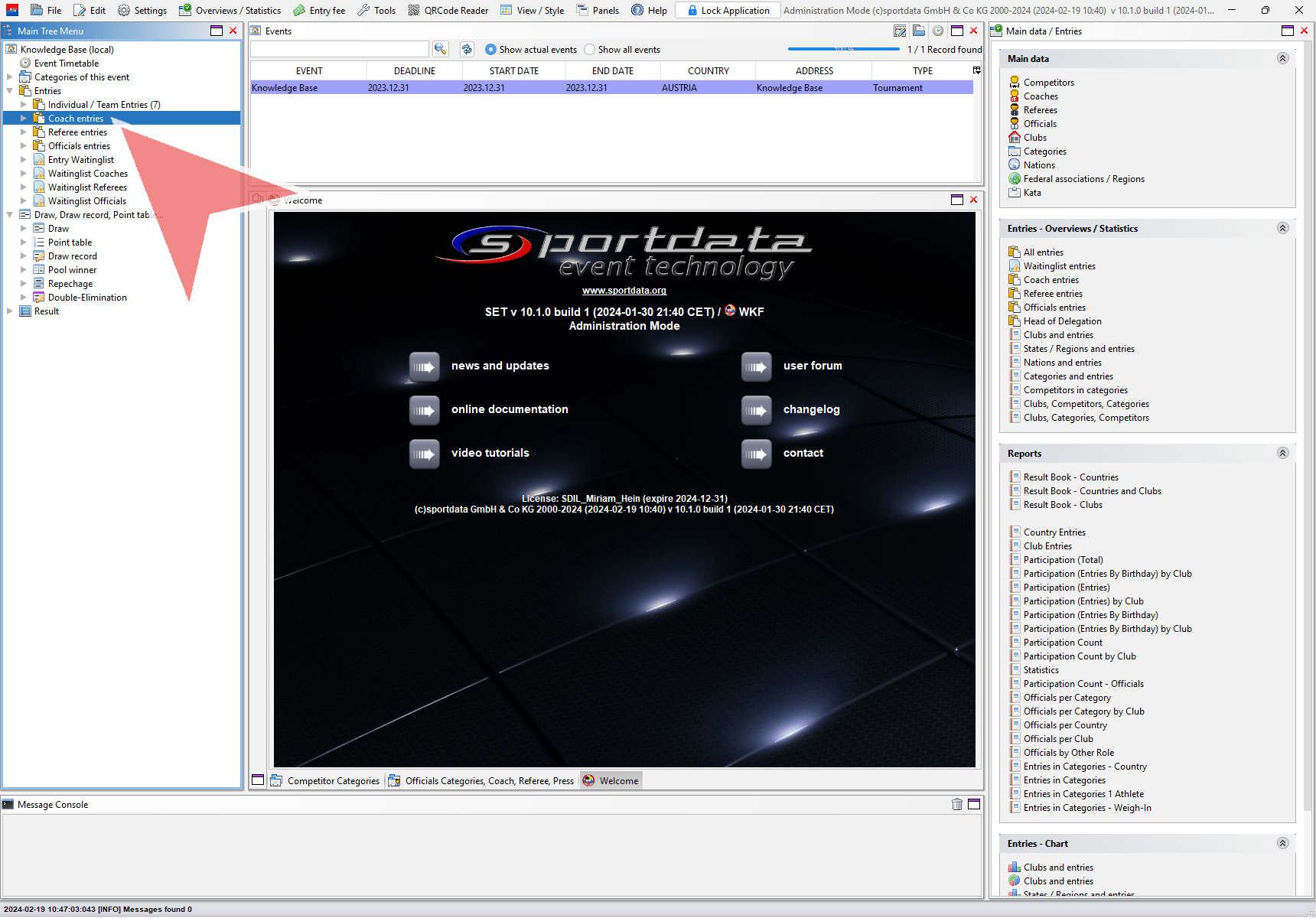 To access the list of all currently registered coaches, rightclick on “Coach entries” in the Main Tree Menu.