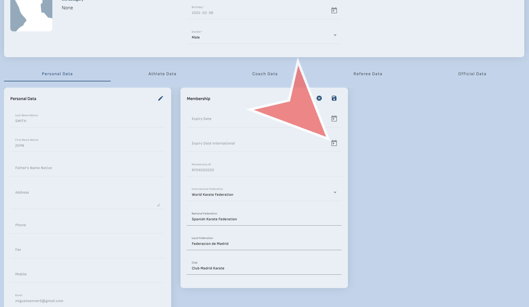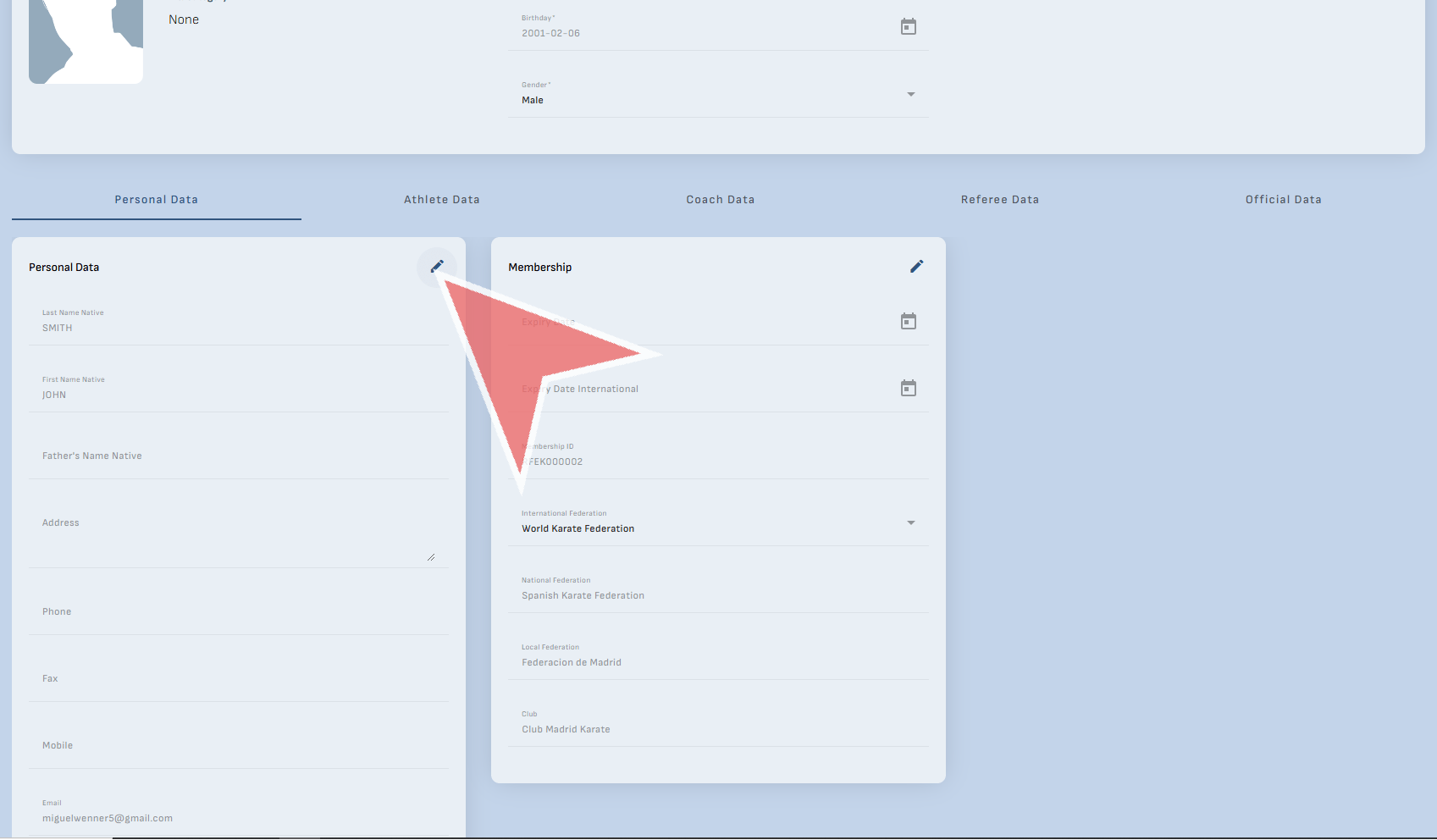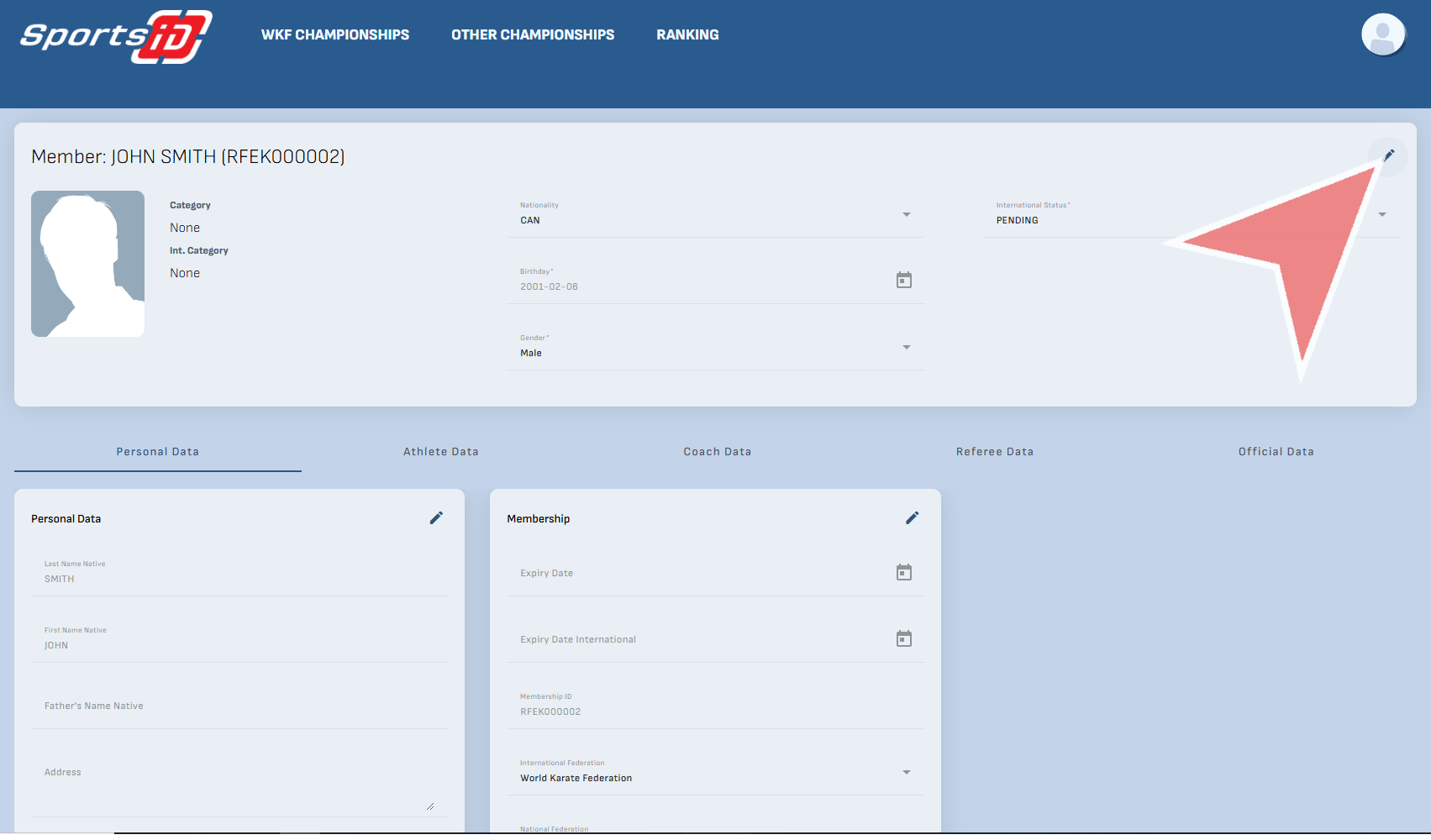 On your profile page, update your photo and details by clicking the edit icon. Your status will be updated by your federations.