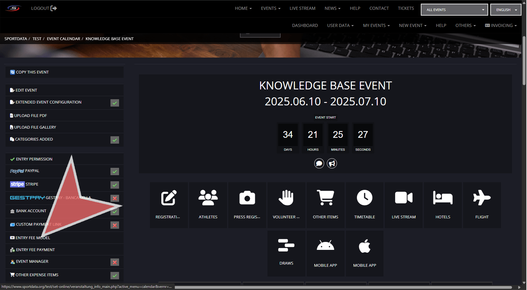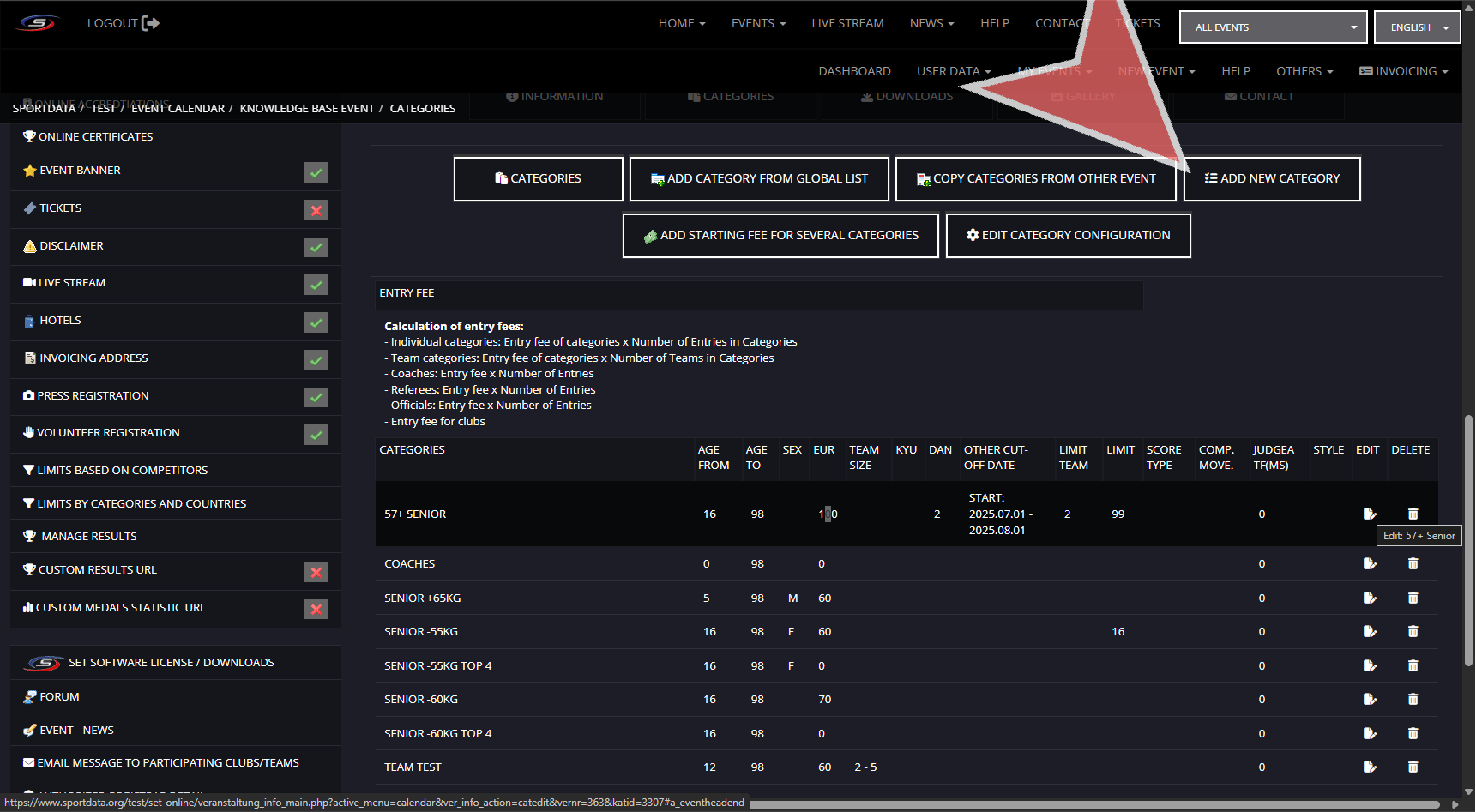 For individual competitor or team categories, the entry fees are determined during the creation of the category, or edited in the category list.