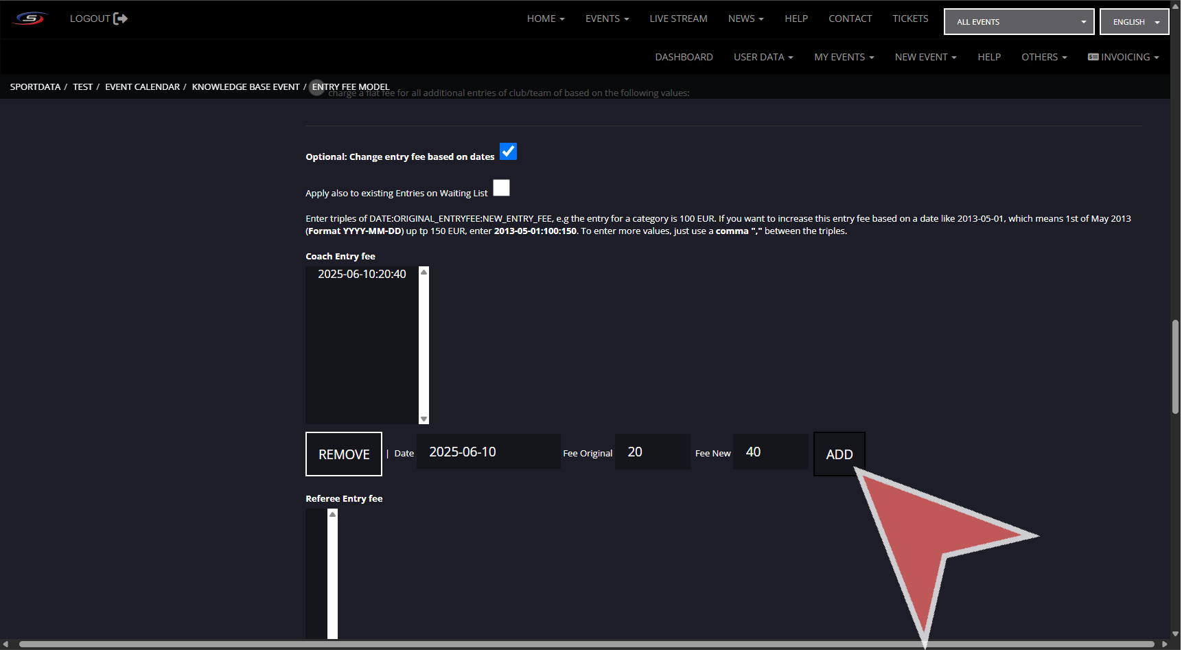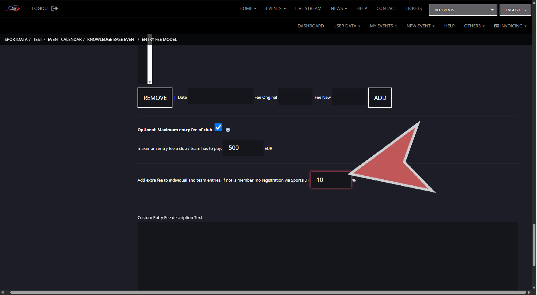 This is an example of where to add individual or team category entre fee.