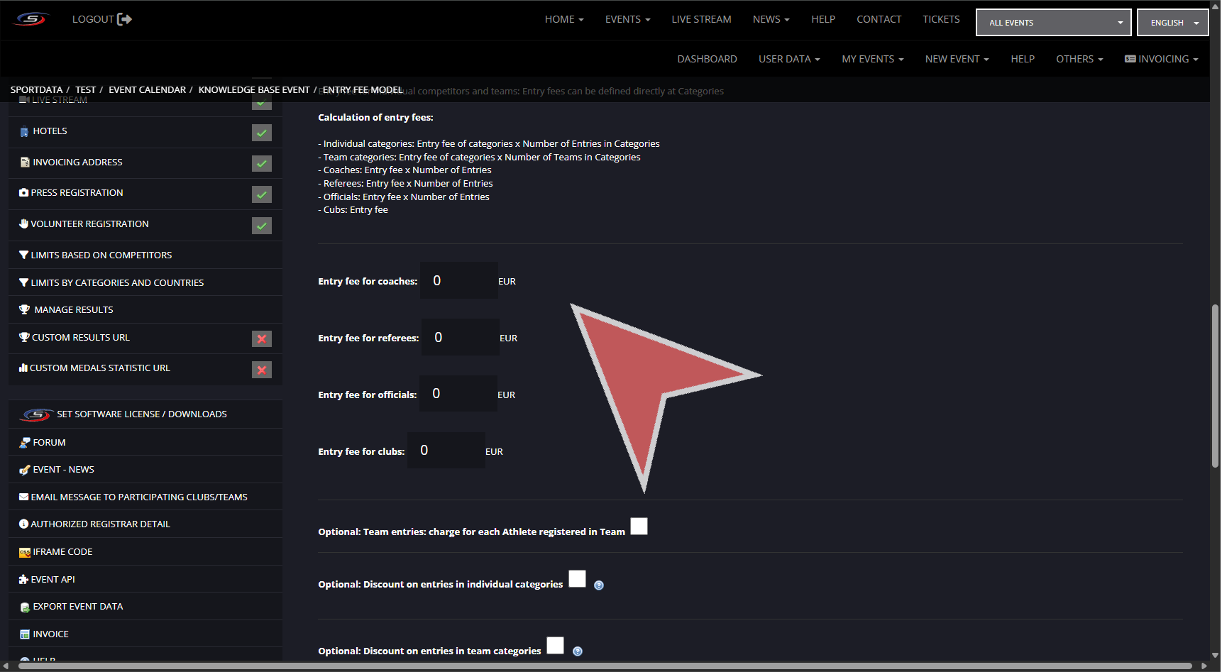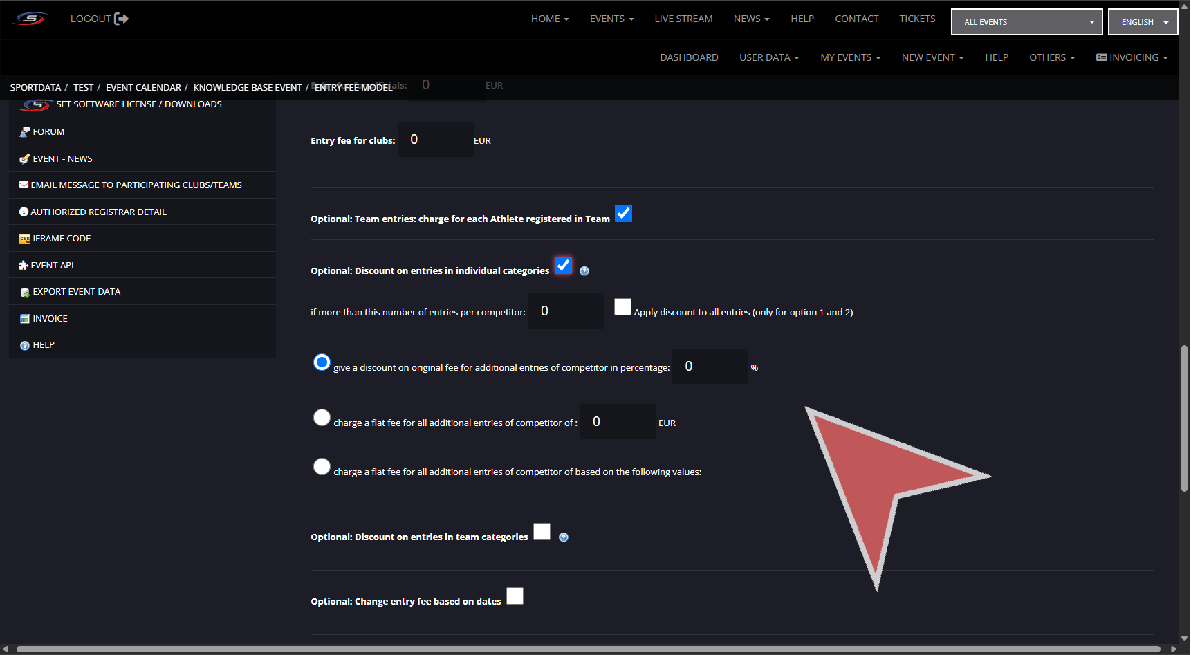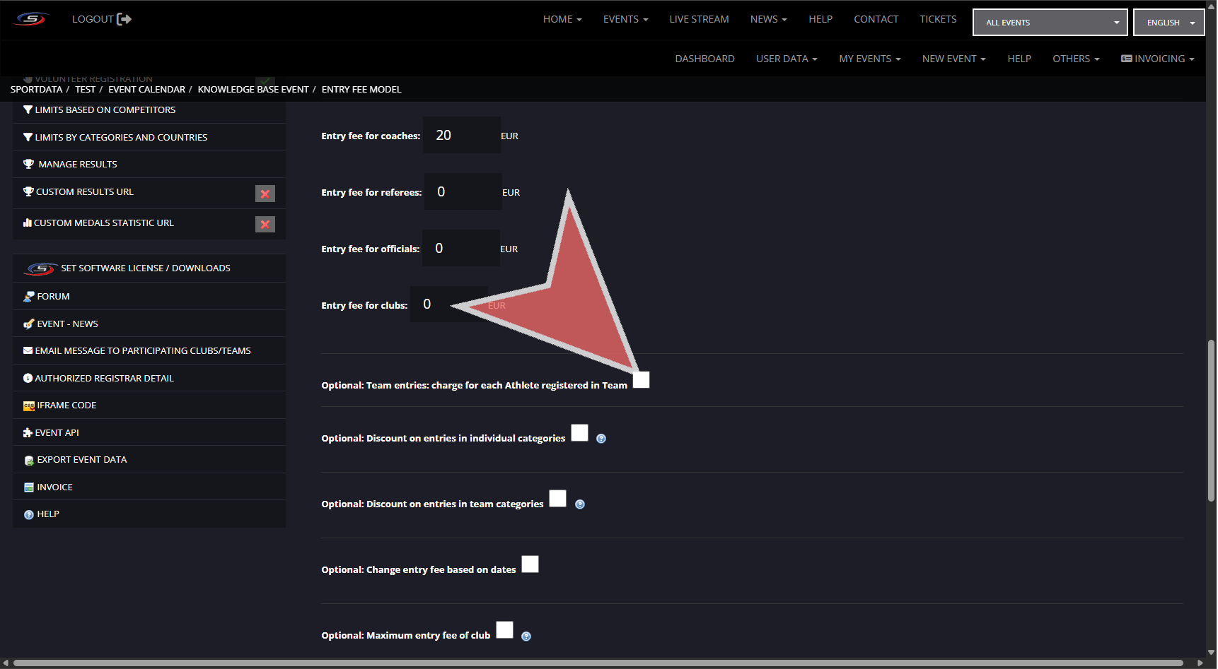 There are multiple settings for determining the entry fee with the competitor and team category entry fees being found when creating categories, and extended settings in entry fee model.