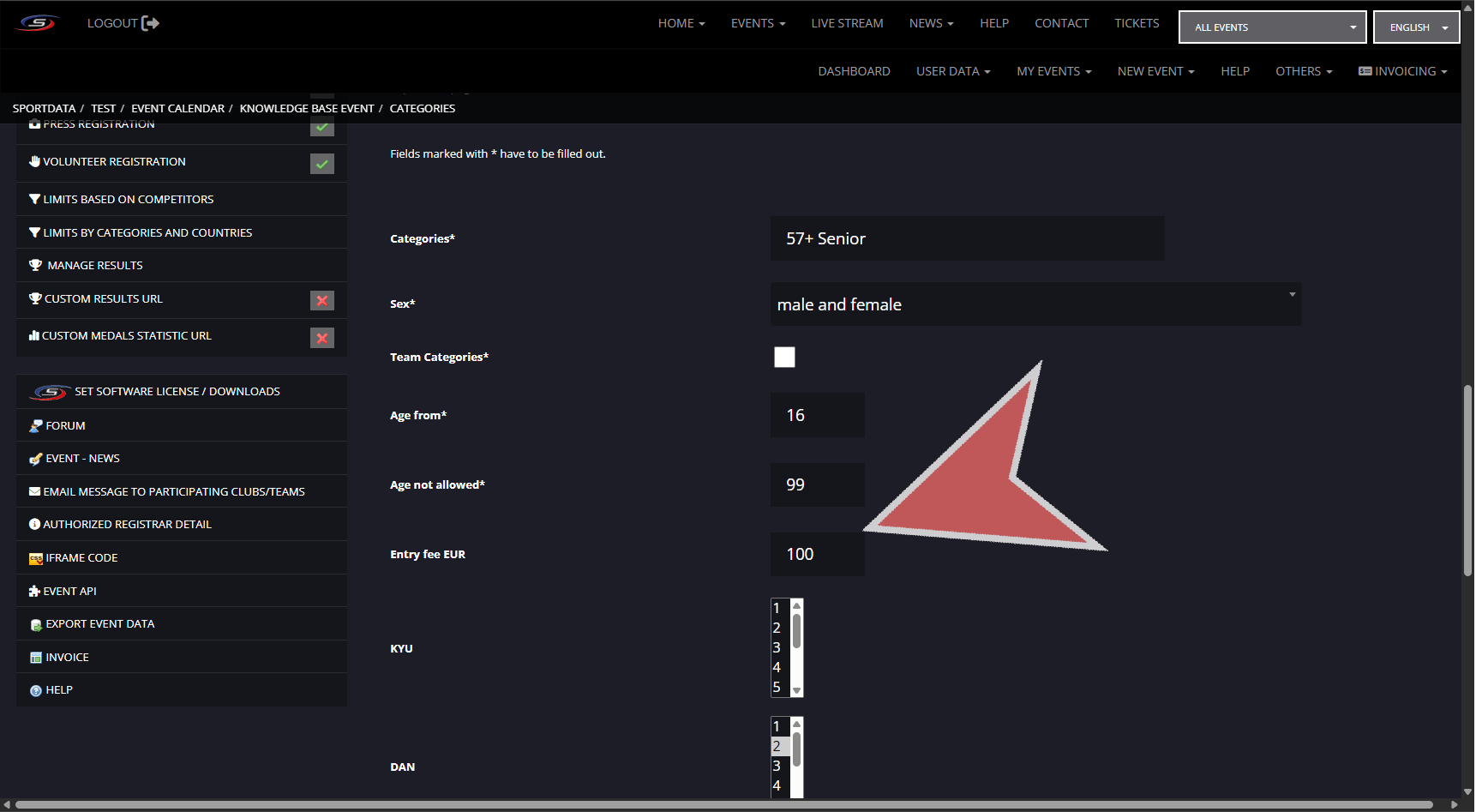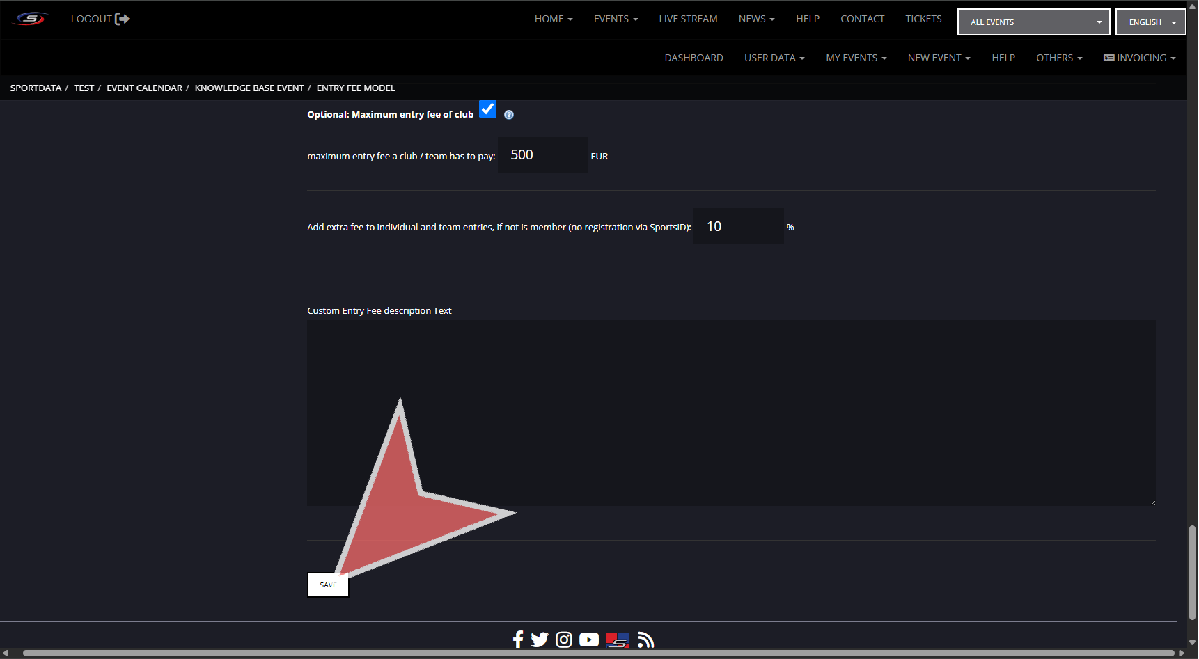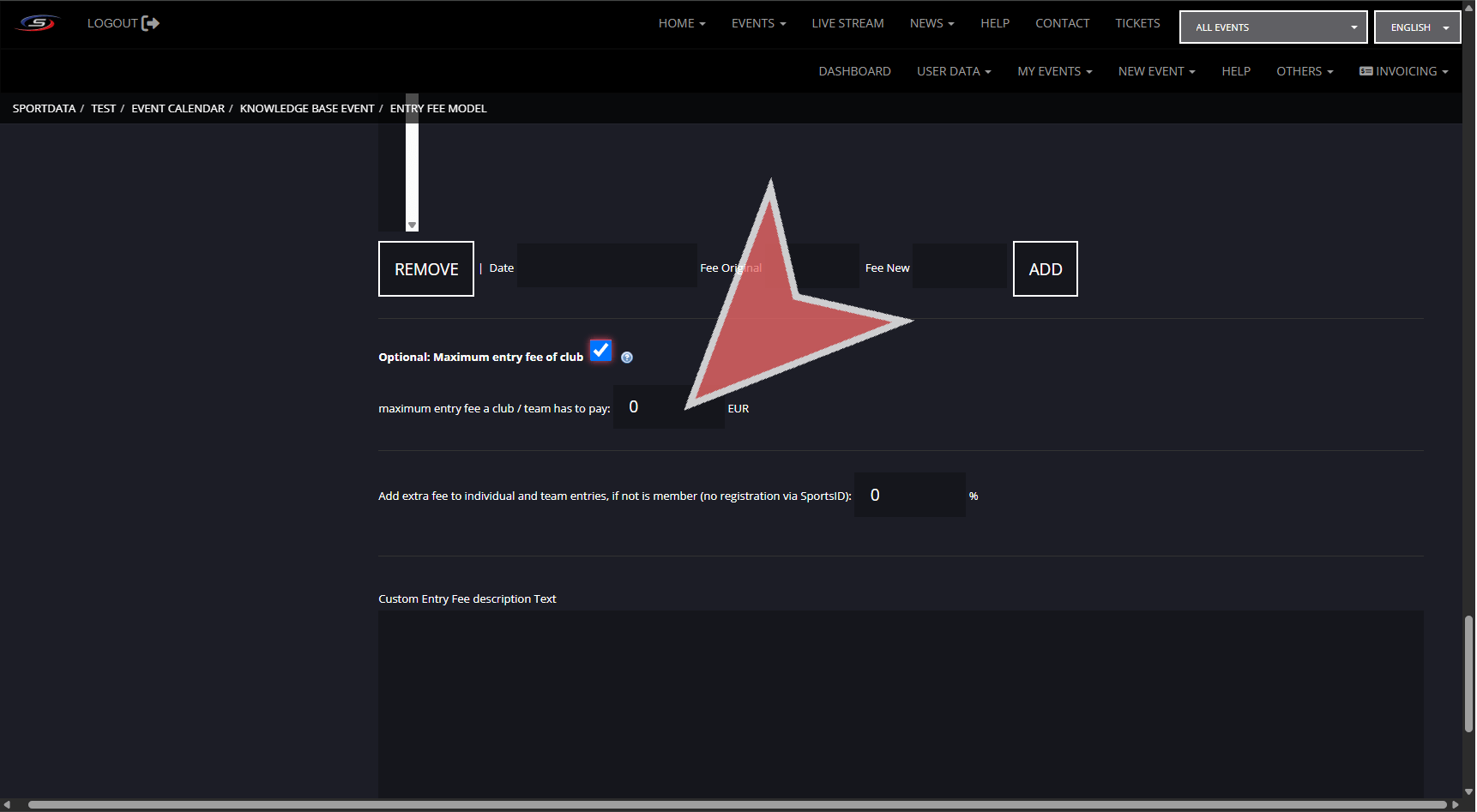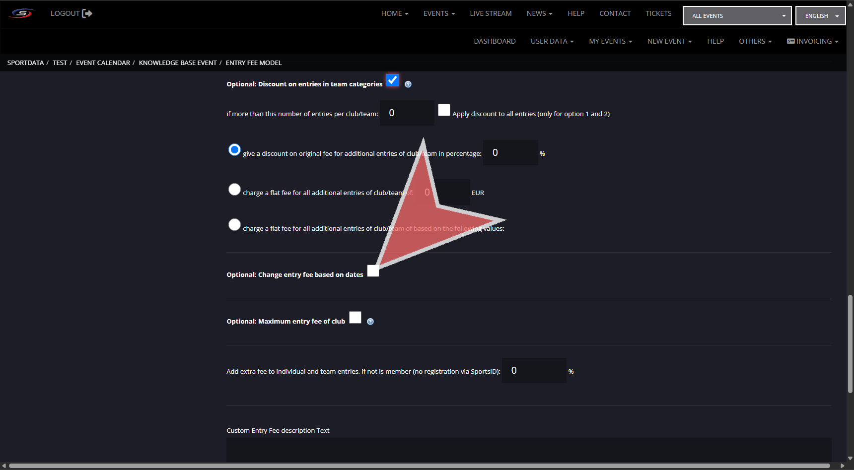 There are multiple settings for determining the entry fee with the competitor and team category entry fees being found when creating categories, and extended settings in entry fee model.