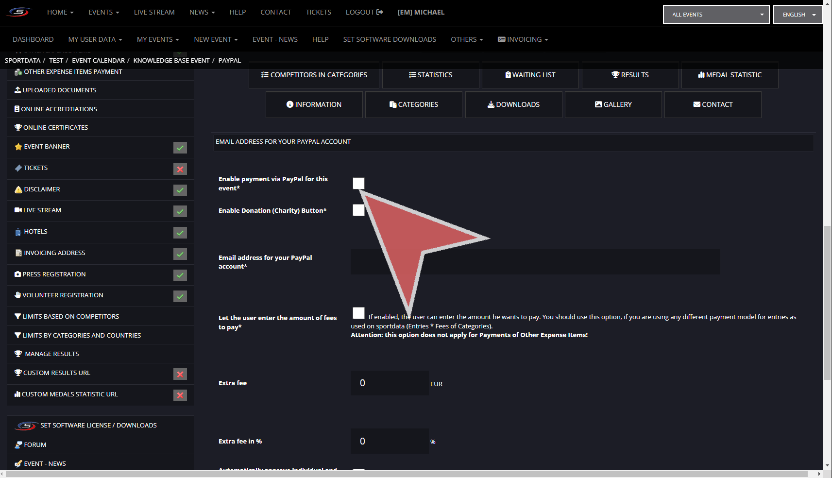 Tick the boxes to enable Paypal for the event, donations, or allow the user to enter the amount of fees to pay. Ensure to add the email address for your PayPal account. If you have extra fees you can either put it either in absolute (euro) or relative terms (%)
