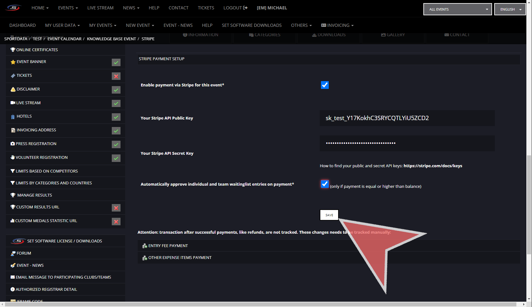 With Stripe, you will have multiple Stripe API keys, both the Public and Secret key that you will need to add in order to link your account. Ensure to tick enable payment via Stripe. Notifications of complete payment will be received by Sportdata and will be tracked and can be reviewed in entry fee payments, however refunds are not tracked.