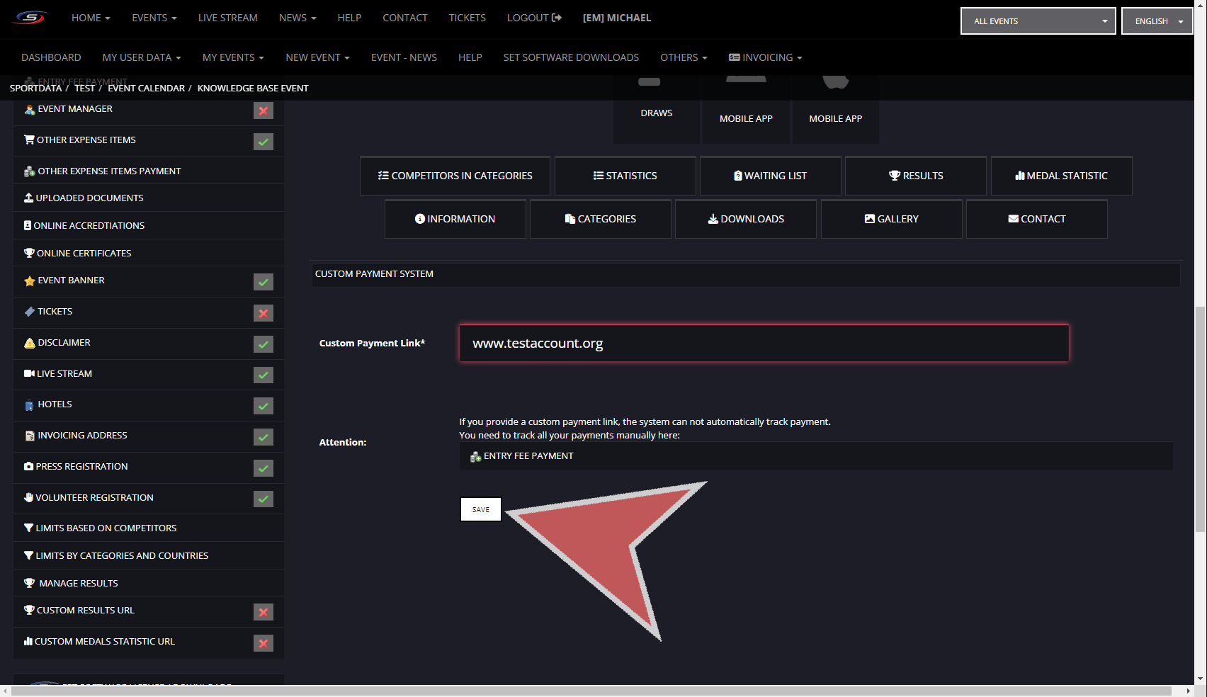 If you have another payment system, you can include the link in the field below and save. Note, that the following Sportdata does not get any notifications from your bank and will not be able to track payments.
