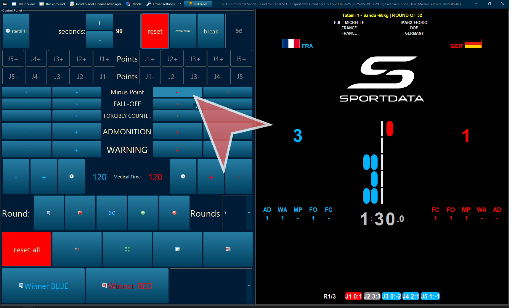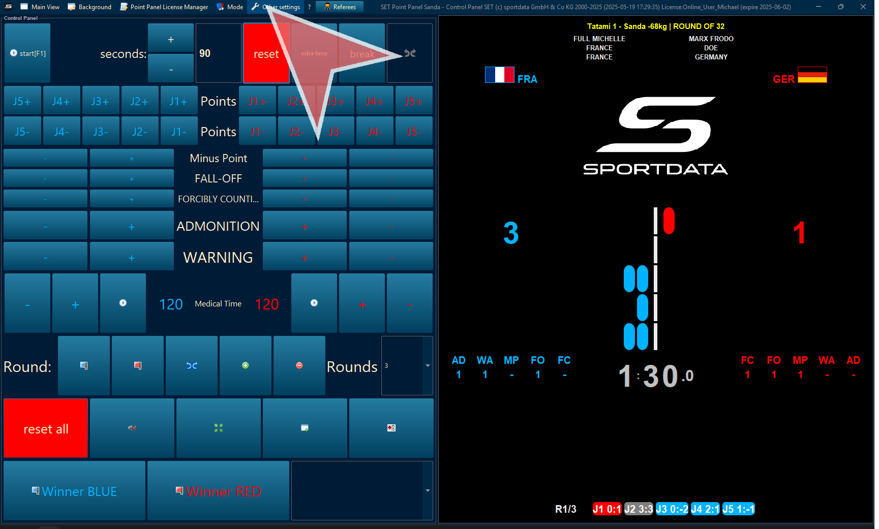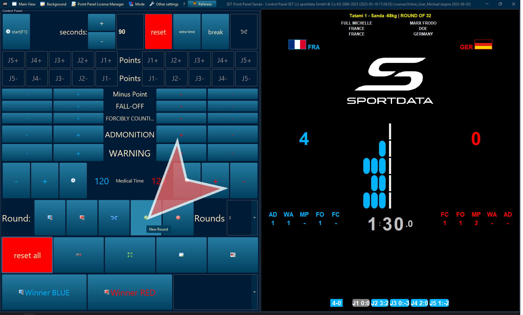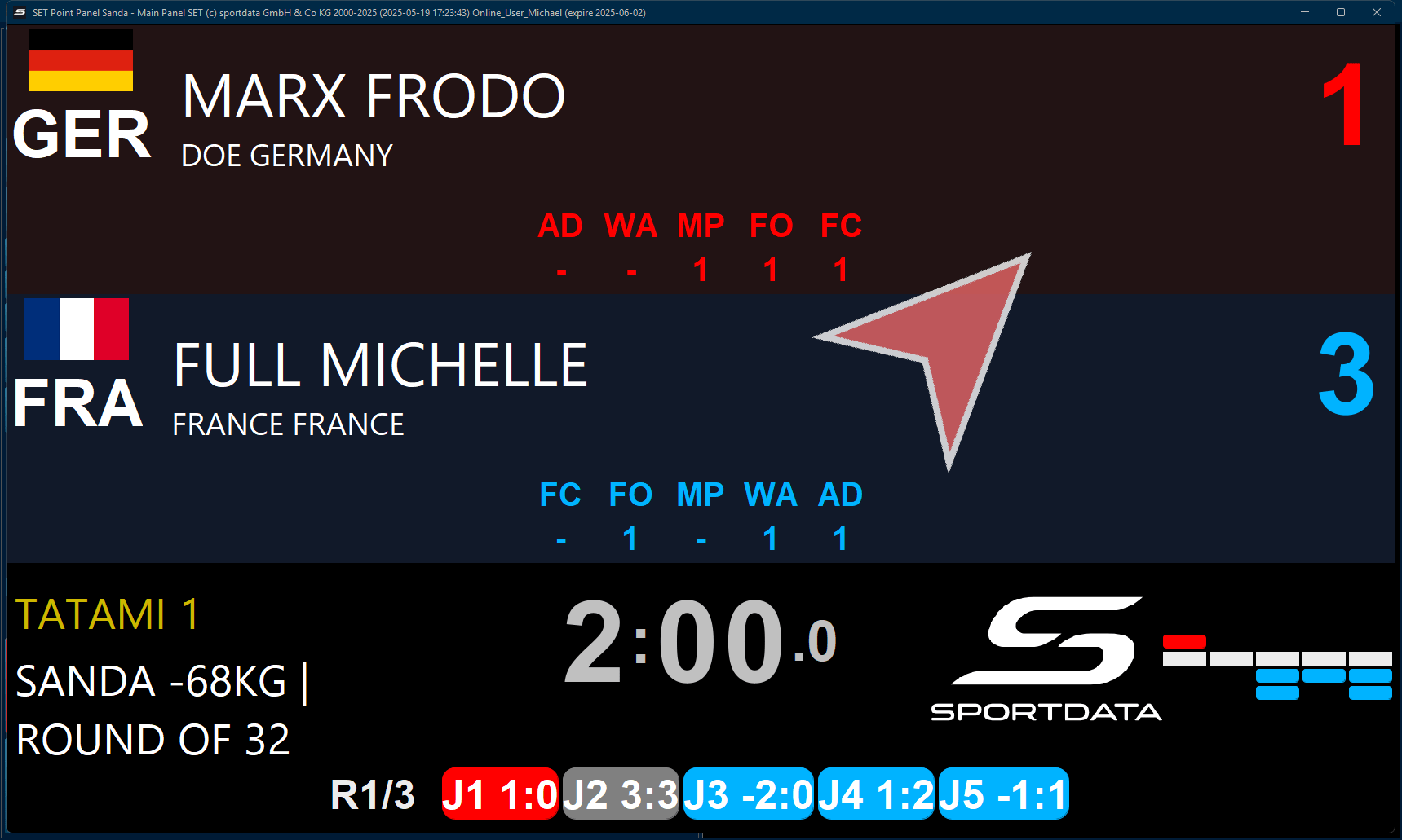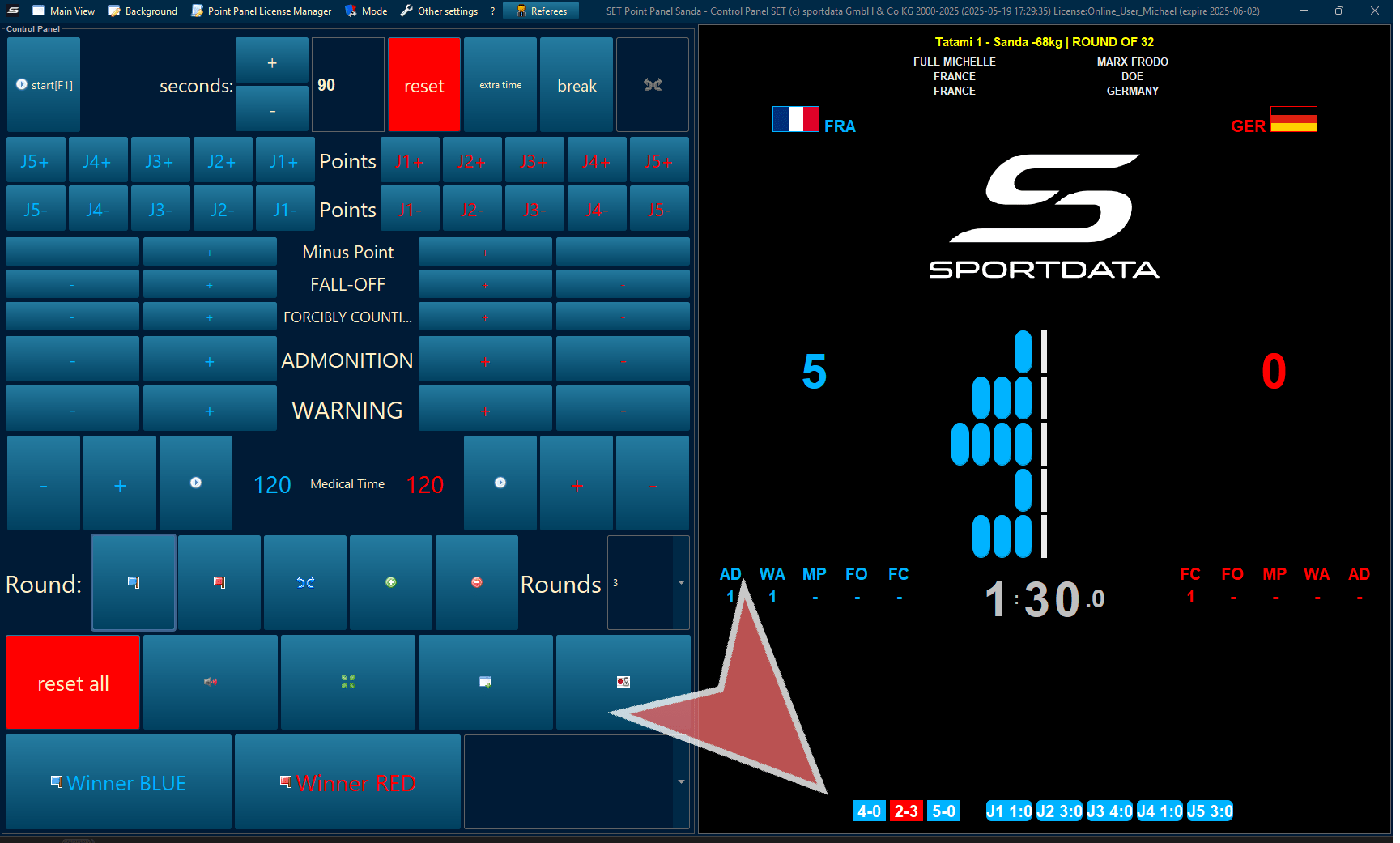 In the scoreboard, you have information about the competitors, warnings, points, location, rounds,time, categories, and the points given by the judges.