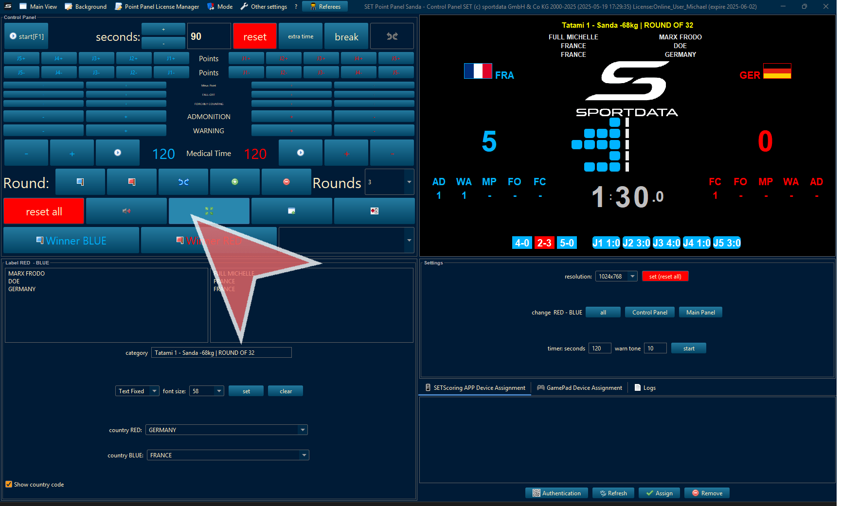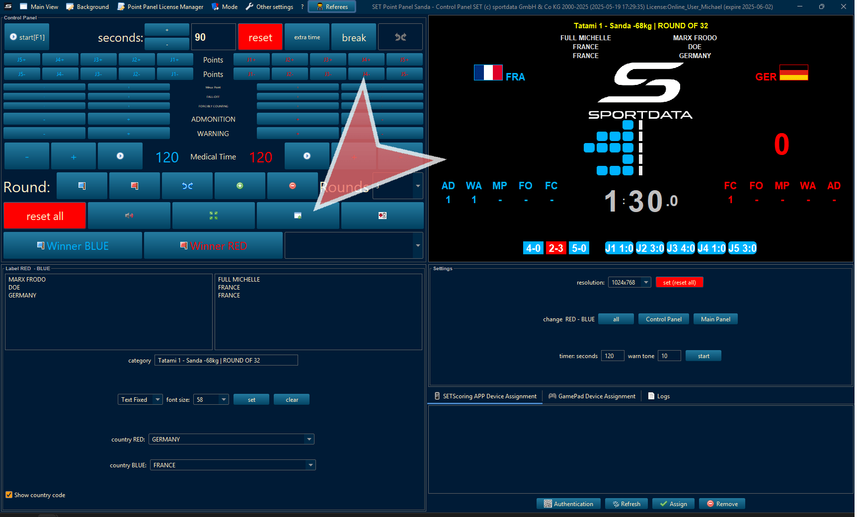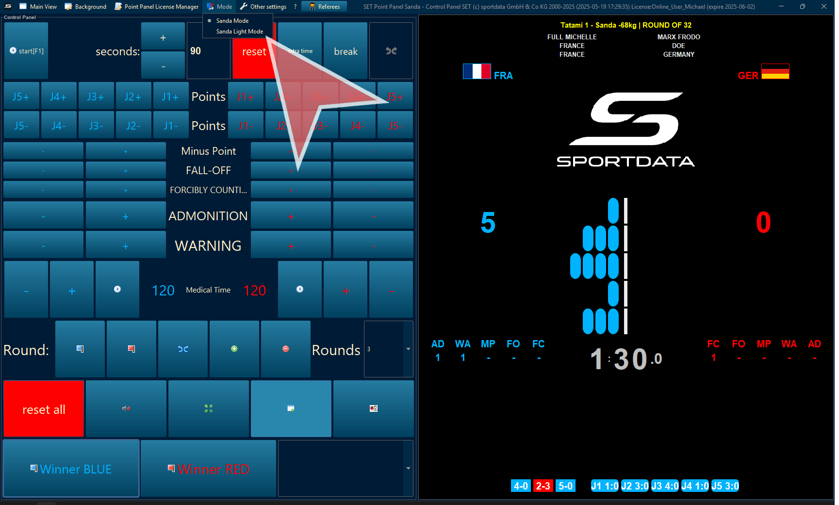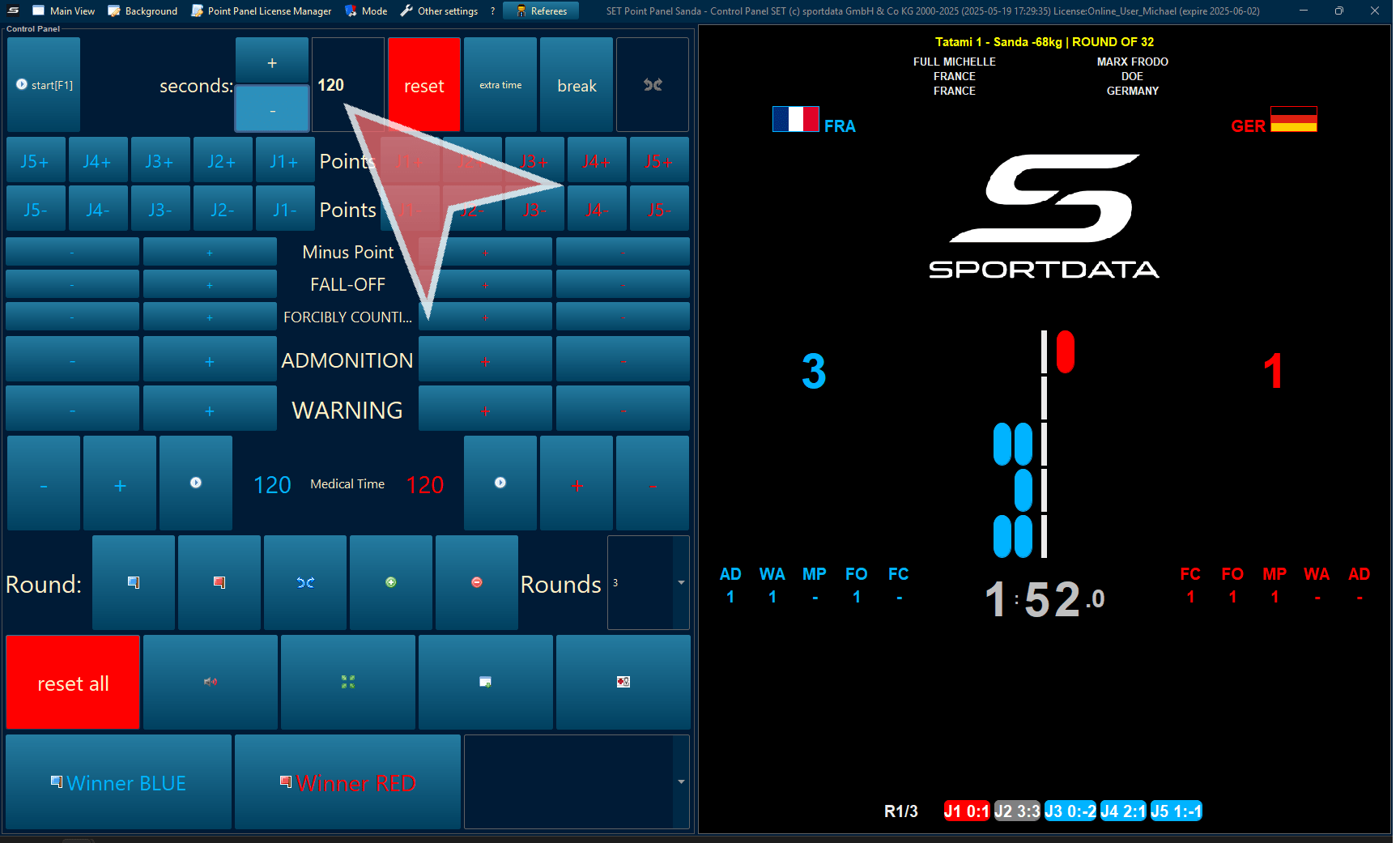 In the scoreboard, you have information about the competitors, warnings, points, location, rounds,time, categories, and the points given by the judges.