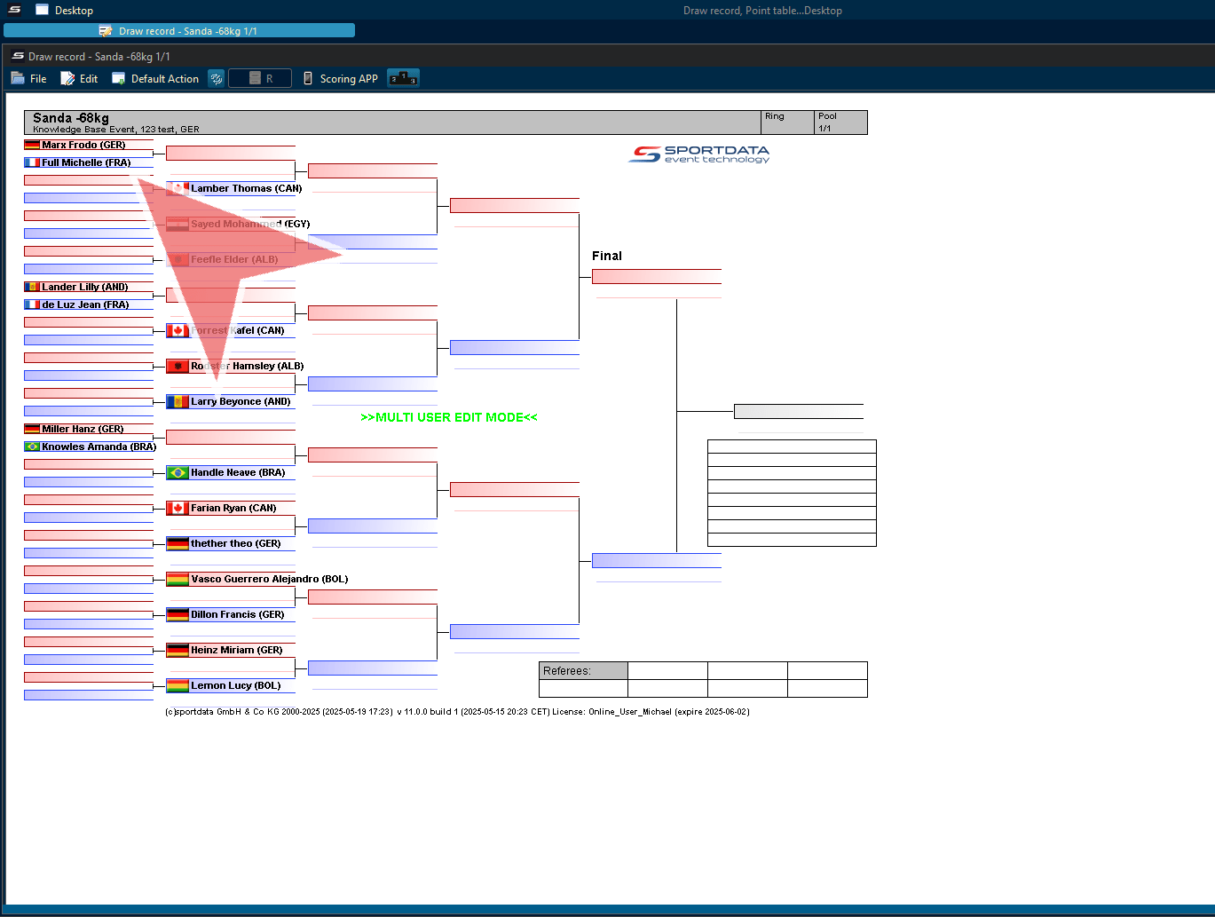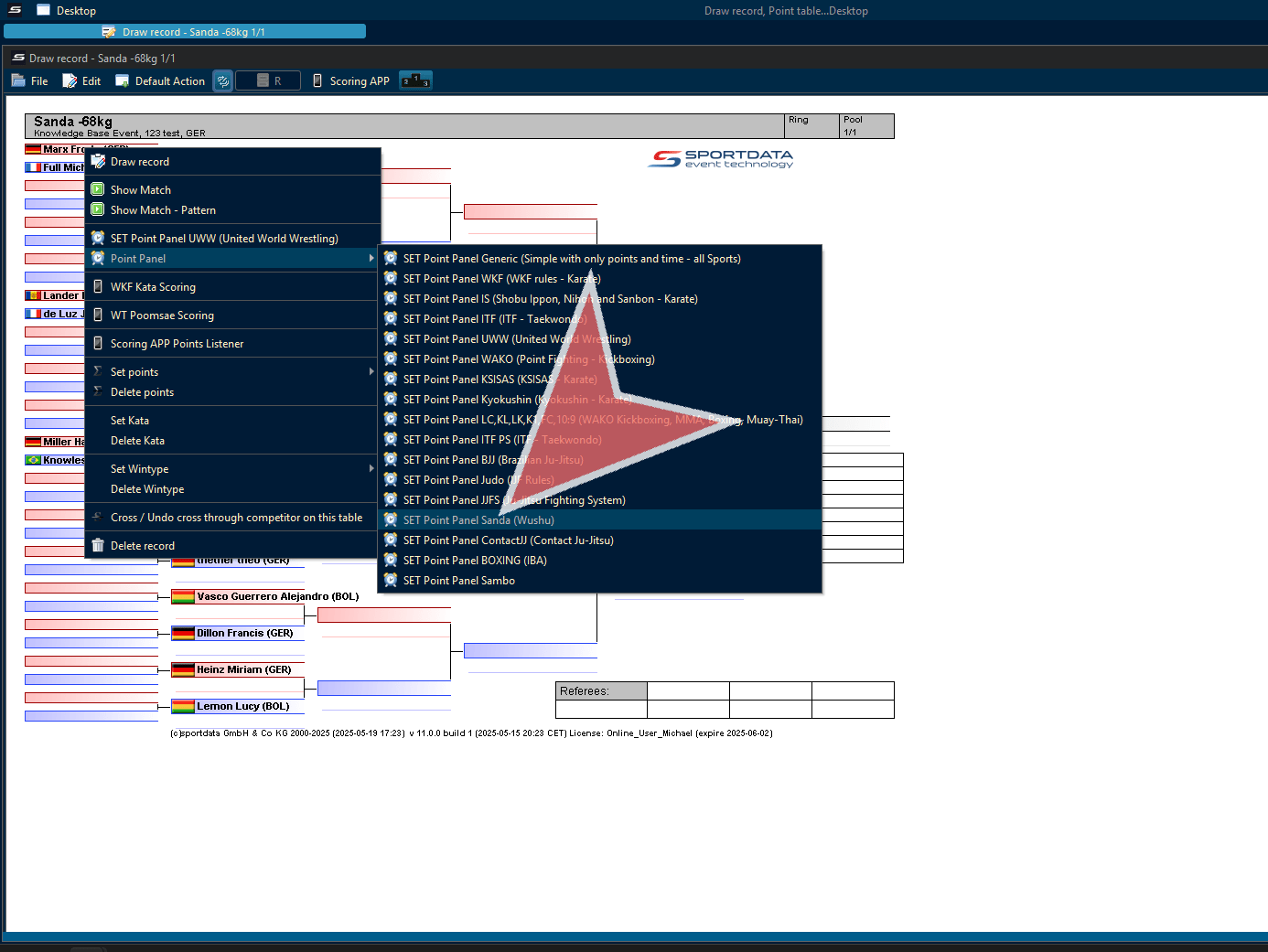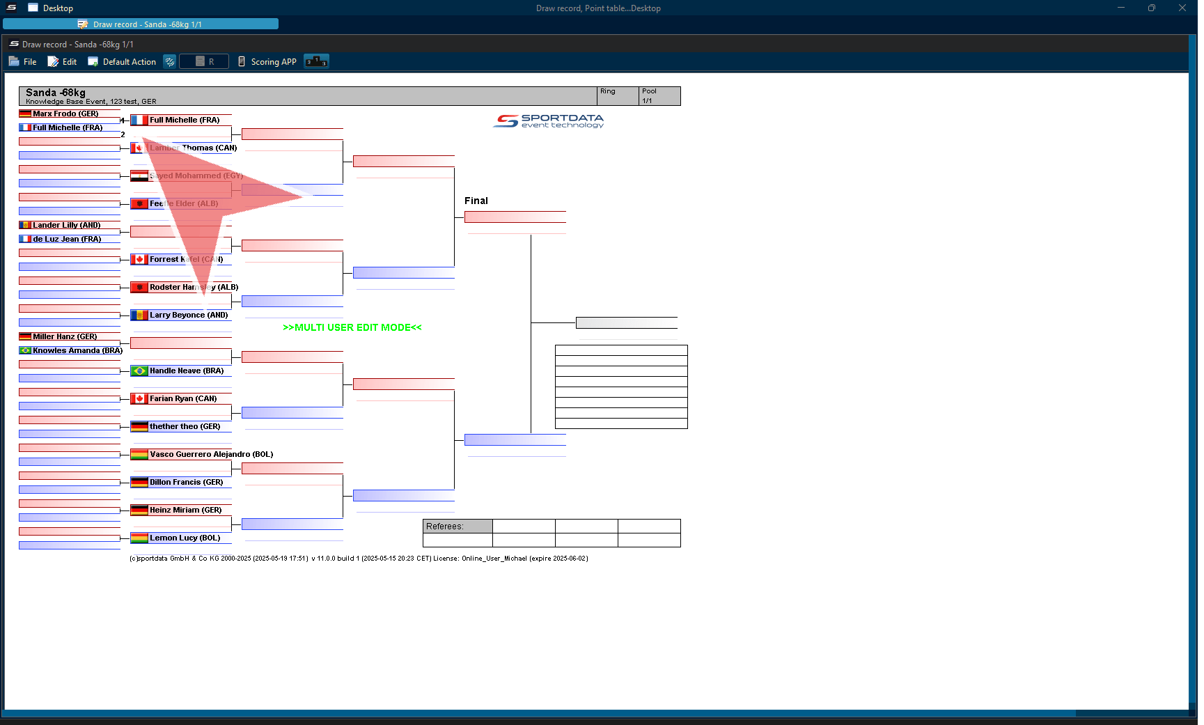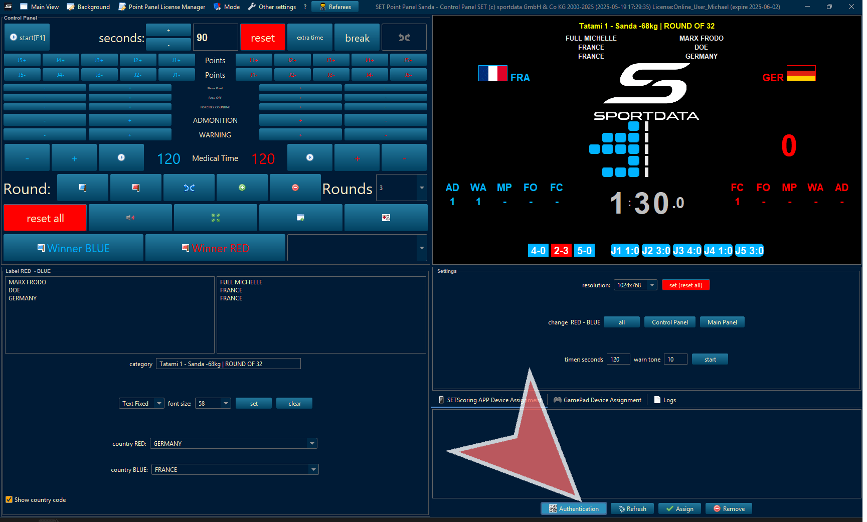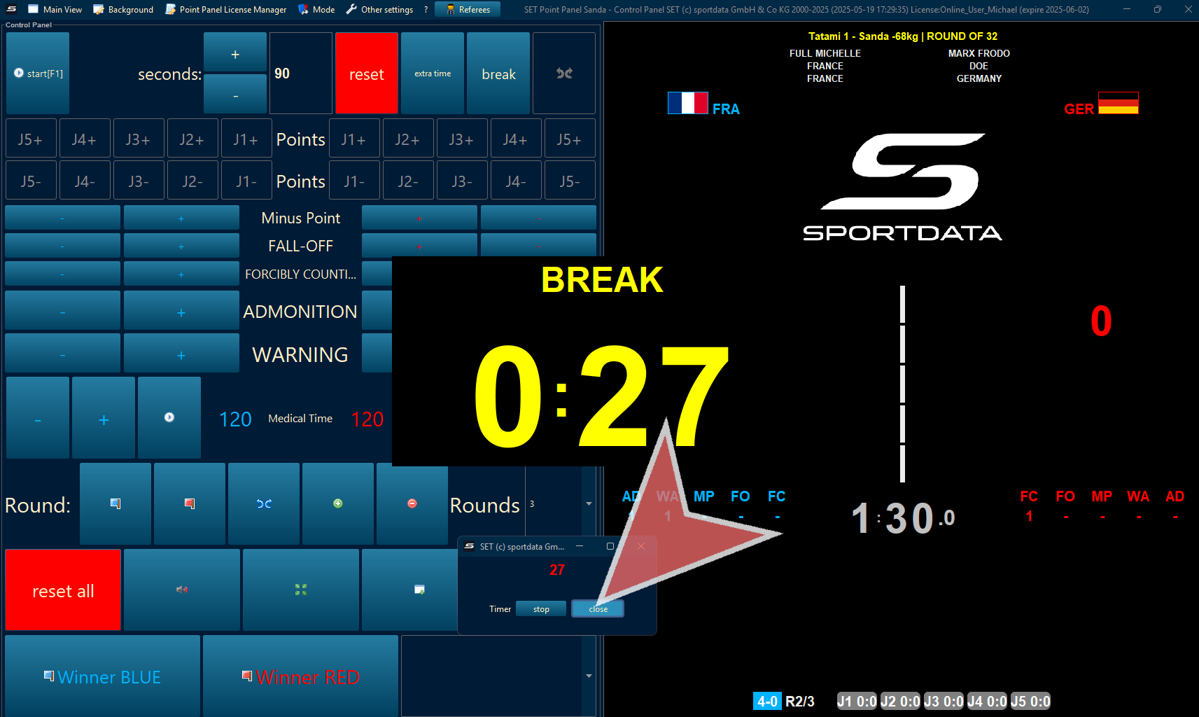In the scoreboard, you have information about the competitors, warnings, points, location, rounds,time, categories, and the points given by the judges.