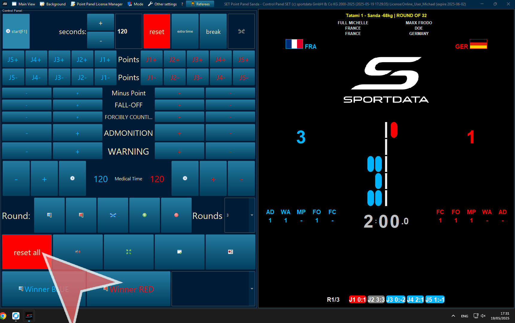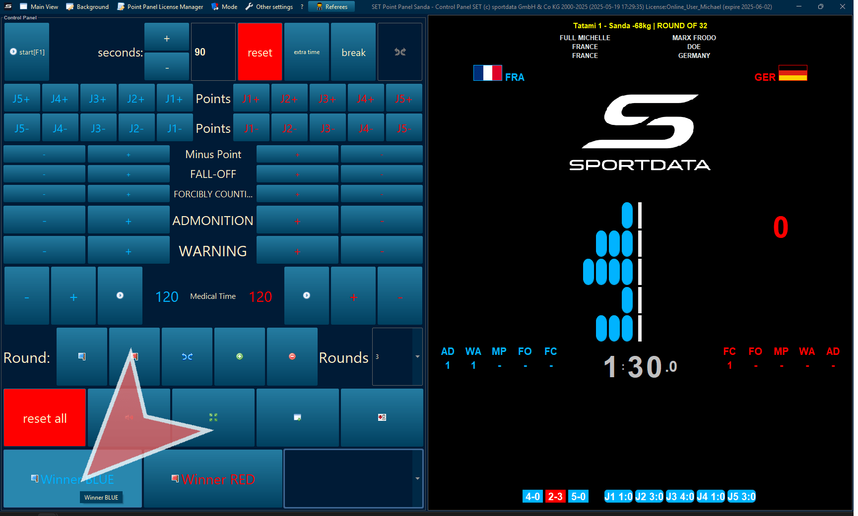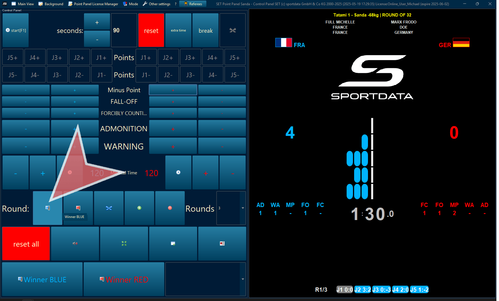 After pressing the blue flag, the judges for and against will be indicated below in blue 4-0.