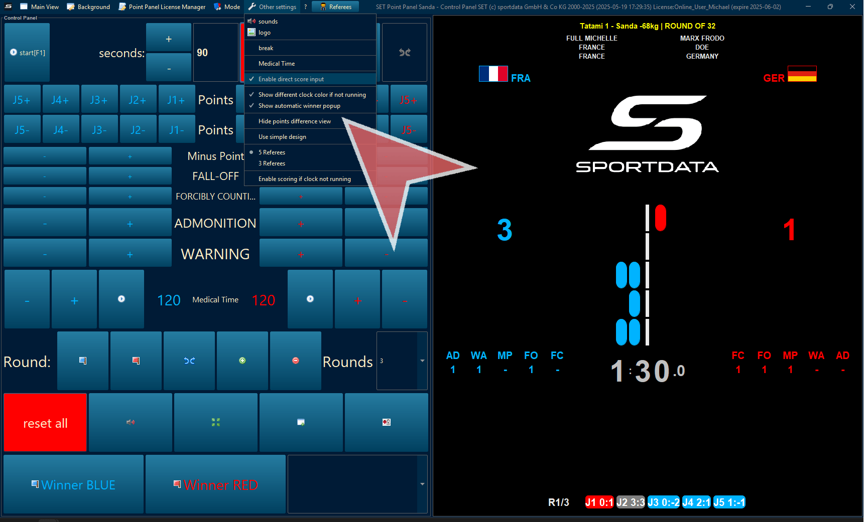 If you are using tablets for scoring or you do not need to do any corrections. You should remove the enable direct score input. You have additional options like use a simpler design, the number of referees, hide the points difference view, and enable the scoring if clock not running which is recommended.