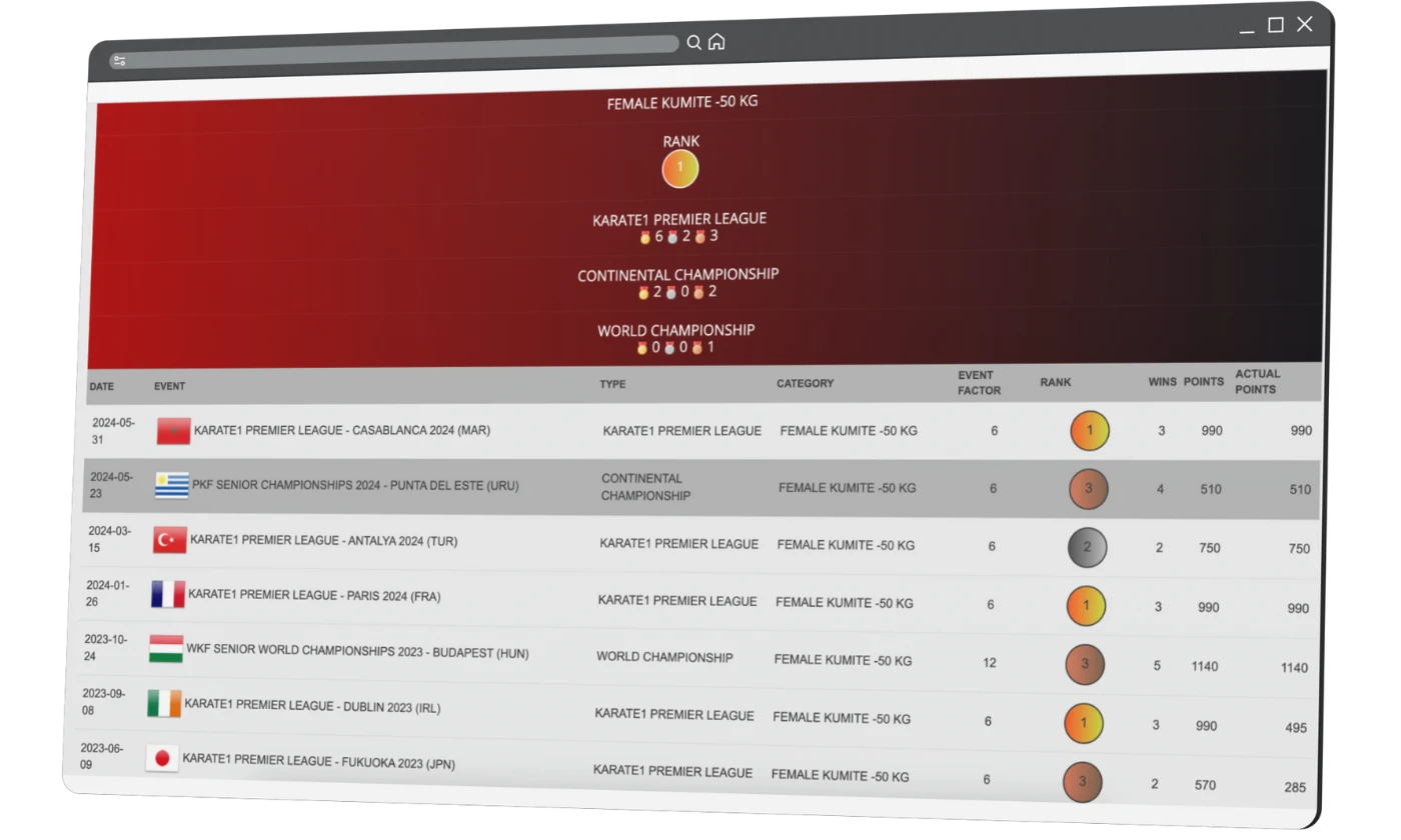 Whether it’s for a season or a qualification process, monitor progress by selecting events and uploading results.