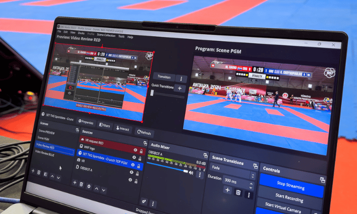 Our system provides an API for broadcasters to access real-time information and render custom graphics. Including bout info, athlete names, country, clock, scores, penalties, results and more.